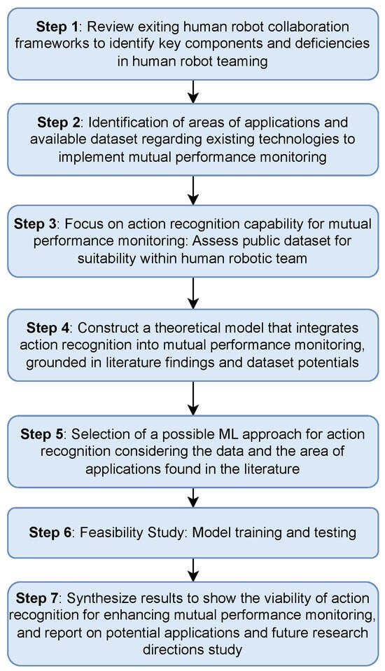 This study presents the framework for implementing MPM within the HrT paradigm. Figure 1 outlines our methodological approach to studying MPM in human–robot teaming, starting from the review of the original HhT framework to the final synthesis of data-driven insights. This study begins with an integrated review of existing human–robot collaboration frameworks and relevant literature on action recognition. This foundation facilitates the process of identifying and evaluating public datasets and technologies relevant to our research aims. The subsequent steps in Figure 1 explain our process of developing a theoretical model, selecting appropriate ML algorithms, and analyzing data to derive meaningful insights into the dynamics of MPM implementation within HrT.