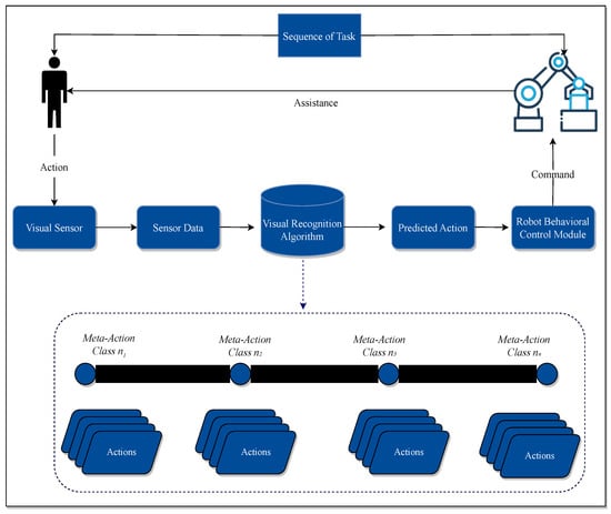 To this end, this study proposes the implementation of action recognition as a pivotal method for realizing MPM in human–robot team environments. Action recognition is a field of ML/computer vision that involves the identification and classification of human actions from video data. It has emerged as a sophisticated and promising approach in contemporary research due to its potential applications in various domains, such as surveillance and human–computer interaction [33]. In the literature, “human action” is often translated as visual action [34], highlighting the significance of visual cues in this field. However, action recognition goes beyond just visual aspects and encompasses a broader range of modalities, such as depth information, pose estimation, and other modalities, enabling a more comprehensive understanding of human actions in diverse scenarios [35]. The process of action recognition involves several steps, including feature extraction, representation learning, and classification. Integrating action recognition into MPM provides a data-driven and objective framework for assessing teammates’ actions. The system can understand their objectives and preferences by developing a computational algorithm that translates human teammates’ actions into a trained model, enabling the robot counterpart to effectively plan and execute subsequent tasks. However, selecting an appropriate ML algorithm [33], developing an efficient feature extraction or learning process, and optimizing model training and evaluation are the foremost considerations. Moreover, it is imperative to consider additional factors, like computational cost and the ability to process data in real time, to guarantee the system’s feasibility and efficacy [30]. This involves selecting algorithms and designing processes that balance computational efficiency and recognition accuracy, thus facilitating real-time interactions in dynamic environments without compromising performance. In particular, implementing a well-designed visual action recognition system is crucial for enabling a robot to accurately comprehend its teammates’ actions. Thus, this paper seeks to address the following research questions: