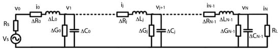 In this work, electrical waves propagated in a cable are characterized by the well-known telegrapher’s equations [,,]. They can be derived either from Maxwell’s equations under appropriate assumptions or from the equivalent circuit of a cable, as illustrated in Figure 1. See, e.g., [,]. Let be the time, be the cable longitudinal coordinate, and and be the distributed voltage and current along the cable at instant t and at position x; the telegrapher’s equations are