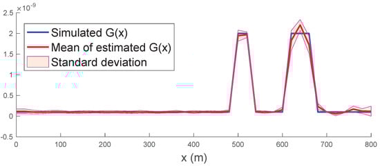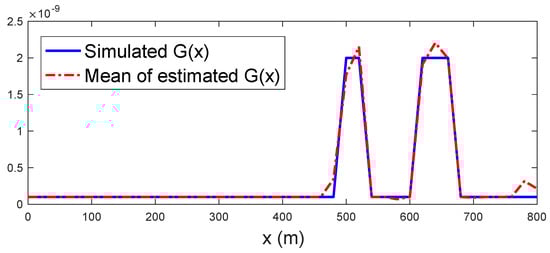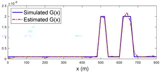 In the simulation result displayed in Figure 2, the blue line represents simulated conductance profile , and the red dotted line represents the estimated conductance profile, both in Siemens/m. Notice that the vertical axis (ordinate) is at the scale of . In this example, the Lasso regression has correctly detected most positions where the conductance deviates from the nominal value. The estimation error is less than Siemens/m.