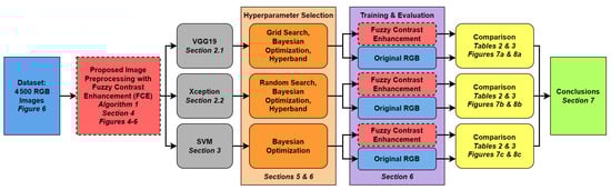 The remainder of this paper is organized as follows: The architectures of the VGG19, Xception, and SVM networks are described in Section 2 and Section 3. The fuzzy contrast enhancement is detailed in Section 4. The formulation and process of hyperparameter tuning, including categories, batch size, loss function, and dropout, are presented in Section 5. The generated dataset of 4500 RGB images and experimental results of the fifteen case studies are presented in Section 6. The last section summarizes the findings, followed by suggestions for future work.