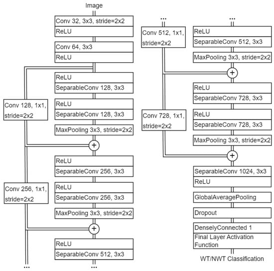 Xception differs from VGG19 due to the Xception module and residual connections that it implements, where data are passed directly from earlier layers in the architecture to later layers by bypassing intermediate layers. These attributes tend to increase the accuracy of the model, which increases its suitability for wind turbine classification, at the cost of computational complexity. As such, the Xception architecture was selected to evaluate the performance of FCE on a complex, nonlinear architecture. The structure of the Xception network architecture used in the case studies presented in this paper, which was abbreviated from the version of the Xception architecture in [], is illustrated in Figure 3.