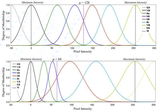 To perform FCE, fuzzy logic rules were used to amplify channel L* (pixel intensity) with a value of 0 being black and 255 being pure white. After isolating the L* channel in the CIELAB color space, the image undergoes fuzzification using the specified fuzzy rule set [,]. This rule set is comprised of a predefined inventory of interval values in which the L* of each pixel is categorized. Gaussian membership functions were used to establish these intervals using if-then rules. The functions vary according to each set of intervals defined for the L* value of the pixel. In this setting, each of the intervals get a classification title: “Extremely Dark (ED)”, “Very Dark (VD)”, “Dark (Da)”, “Slightly Dark (SD)”, “Slightly Bright (SB)”, “Bright (Br)”, “Very Bright (VB)”, and “Extremely Bright (EB)” (see Figure 4). While the intervals for each of these classifications are different, the base equation is the same, a Gaussian function is given by (1)
