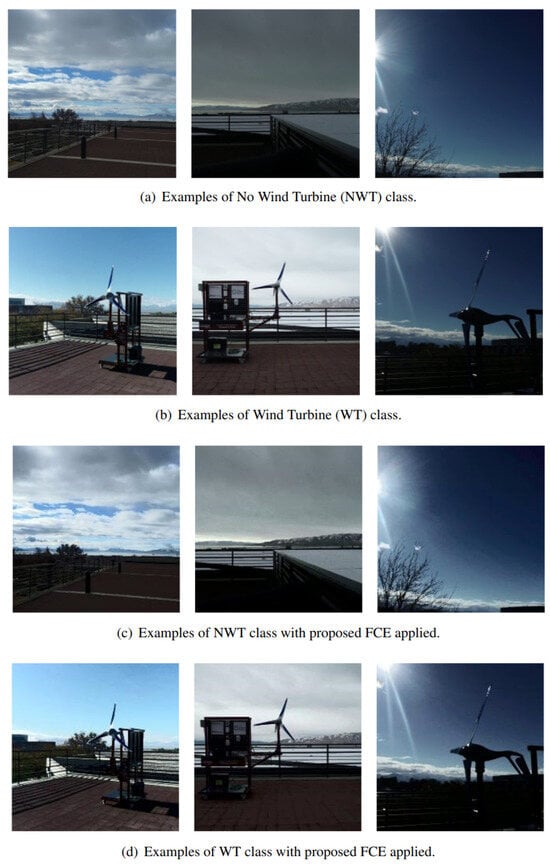 The analysis of machine learning algorithms in this paper prioritized fast training times so that more experimentation and iterative improvement could occur. As a result, the images in the dataset were downscaled to pixels. Additionally, the dataset is separated into 3150 training images and 1350 test images to verify the performance of the machine learning algorithms using previously unseen data. A selection of images from this dataset is displayed in Figure 6, where Figure 6a,b show sample images from the NWT and WT classes, respectively. Figure 6c,d show corresponding images after the application of the proposed FCE preprocessing technique of Section 4.