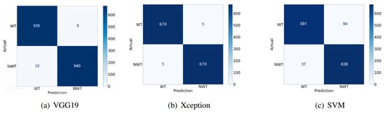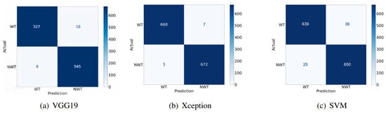 Performance comparison of VGG19, Xception, and SVM without the proposed FCE filters using highest-accuracy confusion matrices.