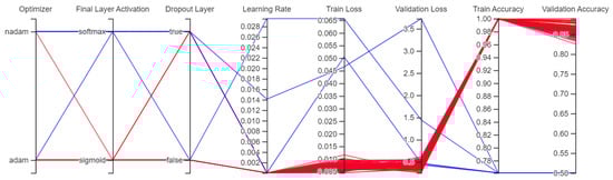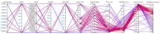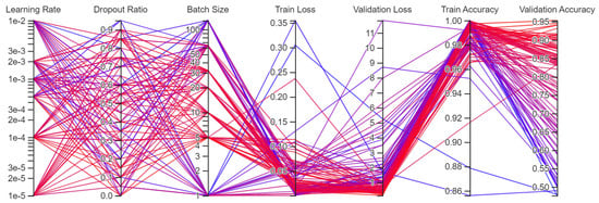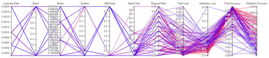 This trial used the same hyperparameters with the same tested values as Case Study B3, but they were tuned with the Hyperband algorithm rather than the Bayesian optimization algorithm. The results are visualized in Figure 12, and the hyperparameters that had the highest averaged accuracies are given in Table 5 under Case Study B4. In Figure 12, note that the accuracies at the low-end of the scale are about 88%. In other case studies, the low end of the scale for accuracies ranged from 50% to about 68%. The Hyperband algorithm resulted in higher accuracies.