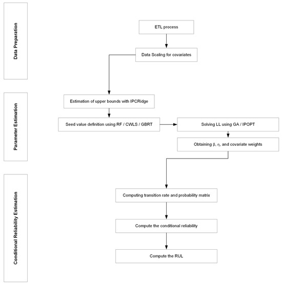 Feature/covariate weighting is an important subject that MLE tries to solve in the present work. The authors of [15] present an approach using Multiple Kernel Learning (MKL), a supervised learning algorithm, for survival prediction models and the convex conjugate function for Cox’s PHM likelihood function. The study shows a robust performance in likelihood function estimation. Also, the MKL allows for the complexity of the boundaries to be avoided. Nevertheless, the study does not consider any assumption on the baseline hazard function, so the distribution parameters are not estimated in the MLE, and it uses a modified convex loss function for MLE. Study [36] proposes a Neural Network (NN) autoencoding (unsupervised learning) approach to estimate the robust features of a set. Then, Cox’s PHM and Long-Short Term Memory NN (LSTM) are used to predict the time between failures (TBF). So, the authors select the most important features for the prediction and use Cox’s PHM to obtain a reliability curve. They use MLE for the baseline hazard function and covariate weighting, but they do not specify any method to solve MLE. Ref. [26] uses reinforcement learning (Q-learning), Random Forest (RF) algorithm (supervised learning), and Markov Decision Process (MDP) for CBM optimization. The transition probability matrix is not used because the study relies completely on the meta-heuristics algorithms to obtain the reliability curves based on the Kaplan–Meier estimation method, which is non-parametric and asymptotically efficient [37,38], so the covariate weighting is made by using this method. Also, teh authors do not assume any distribution for wear-out; RF is used to predict this phenomenon. MDP incorporates the state space (defined by RF), action space (preventive and corrective interventions, `’do-nothing” policy, and multi-level preventive repair, `’as good as new” repair included), rewards (RUL), and punishments (maintenance cost). Q-learning is used to simulate a decision-maker agent that decides the action based on the “current” conditions of the data, costs, and expected RUL. A matter of concern for this study is the high computational cost related to the Q-learning method.