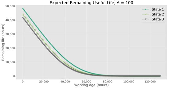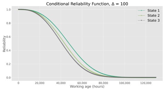 Then, Figure 2 shows the corresponding conditional reliability functions using the probability transition matrices as input to the aforementioned product property method. The reliability behavior for each state is similar. Consequently, State 1 corresponds to the state where the asset exhibits the highest reliability, followed by State 2 and then State 3, which present the lowest reliability over time.