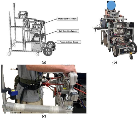 The power-assisted NDT trainer. (a) The trainer designs. (b) The hardware. (c) The rope attached to the subject’s ASIS.