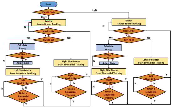 We invited therapists to conduct clinical NDT training and observed their actions. During the training, the therapists guided the subject’s motions by using the ropes attached to the subject’s ASIS. We recorded the therapists’ applied forces and the subjects’ motions to analyze the therapists’ intervention patterns [14,18]. First, the therapists applied forces to cue the subject’s opposite ASIS when they observed the subject’s HS. The intervention forces were approximately sinusoidal, as shown in Appendix A [18]. Second, the therapist increased the applied forces when they observed insufficient pelvic rotation, as illustrated in Appendix C [18]. Therefore, we implemented these intervention patterns to control the NDT motors, as shown in Figure 2, which produced the corresponding forces to cue the subjects’ ASIS through the ropes. When the gait-detection system identifies an HS, the motor-control system tracks the following command to cue the opposite ASIS [18]: