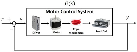Because the rope provided only traction forces, we conducted closed-loop identification. The block diagram of the rope motor-control system is illustrated in Figure 3, where we sent the swept sinusoidal input signals r with magnitudes of 1–6 pounds and frequencies of 0.01–2 Hz. We then measured the motor drive signal u and the output force y. The system transfer functions were then derived by the Matlab command tfest by using these signals. Considering system variation and uncertainties, we repeated the experiments ten times to derive the following transfer functions: