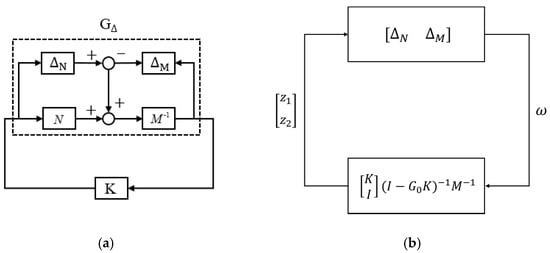 We applied the nominal plant to design a robust controller. Considering a closed-loop system with a controller K (see Figure 4a), we can rearrange the system as the standard block diagram for the Small-Gain Theorem (see Figure 4b) because system stability is independent of input signals. According to the Small-Gain Theorem [21], the closed-loop system is internally stable for all perturbations with if and only if [21]: