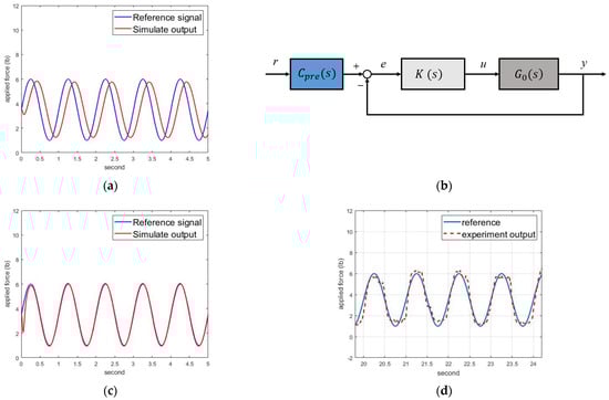 Responses of the rope motor system. (a) Simulational tracking responses. (b) Block diagram with a pre-compensator. (c) Simulational tracking responses with the pre-compensator. (d) Experimental tracking responses.