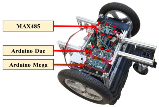 Figure 7 illustrates the power-assisted device. The main control microprocessor is an Arduino Due [23], which sends pulse-width modulation (PWM) signals to the wheel motor drivers. The second microprocessor is an Arduino Mega [24], equipped with an MAX485 communication module to receive feedback signals from the motors and the laser-distance sensor.