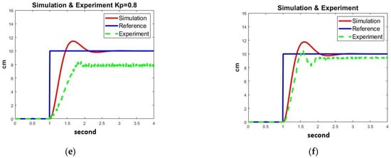 The gain-scheduling-control design was conducted empirically because the control signal u should be large enough to overcome frictions and small enough to avoid overshoots. We tuned the controller gain and verified its effects iteratively. For example, when , the stability margin was with the system response as shown in Figure 8d, where the overshoot and steady-state error were significant due to friction. On the other hand, when , the stability margin was with the system response, as shown in Figure 8e, where the steady-state error was negative because of the low gain and friction. Therefore, we designed the following gain-scheduling control: