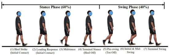 A complete gait cycle is illustrated in Figure 9, which comprises three essential gait events: the MS, HS, and TO. The swing phase of a leg is defined as the duration between the leg’s TO and its subsequent HS and accounts for about 40% of a gait cycle [25] while the stance phase takes the remaining 60%.