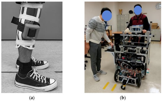 - Healthy subjects: The healthy subjects wore a joint restrictor with a 2 kg block on one knee, as shown in Figure 10a; the joint restrictor constrained their knee flexion to simulate stroke patients’ gait patterns. Each participant performed the following two sets of experiments to validate the effectiveness of the power-assisted device: