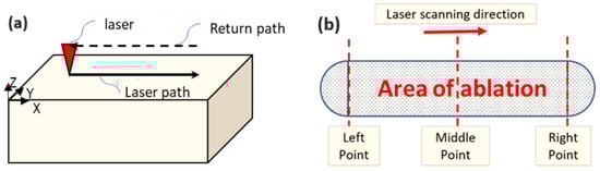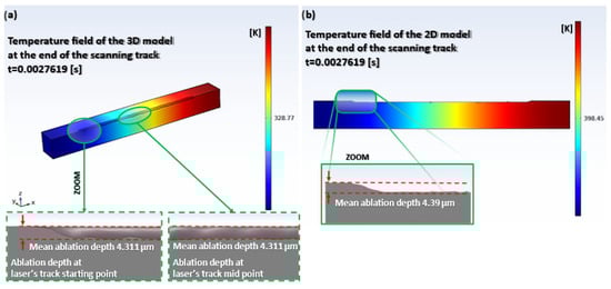 Due to the need to run the simulation for each pattern repeat multiple times, the computational time would be significantly high. To reduce the computational time, a model reduction from 3D to 2D is employed []. However, to apply the model reduction, it is necessary to firstly prove that the error between the 3D and the 2D ablation depths is negligible. For this reason, the 1st pattern repeat is simulated for both 3D (Figure 2a) and 2D (Figure 2b) models. It is deduced that the reduced 2D model can accurately model and predict material ablation, as the obtained results align with those from the 3D model.