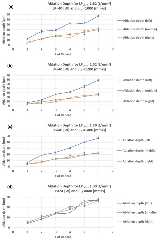 Ablation depths for (a) 1.82 [J/mm2], (b) 1.52 [J/mm2], (c) 1.30 [J/mm2], and (d) 1.82 [J/mm2] with 24 [W] LP.