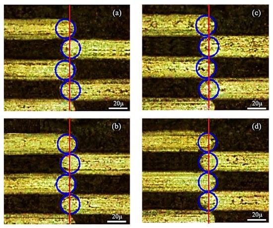 Influence of different time lags- (a) 80 µs (b) 90 µs (c) 110 µs (d) 120 µs. The red line indicates to symmetrical axis and blue circles to the beam spot at the end of scanning path.