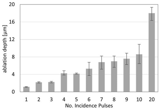 Different values are tested to determine the optimum time lag values (see Figure 4a–d, where the time lag is decreased). The two lines are correctly adjusted to the value of 120 [µs] (Figure 4d). Nevertheless, it is necessary to note that, by adjusting the time lag value correctly, the start points of the two parallel lines meet each other at the same position; however, the number of incident pulses at the very beginning of the scanning line is still higher than that at the middle and end of the line. From a practical point of view, this phenomenon becomes considerably intensified when higher frequency values are selected, particularly when the laser has to traverse the entire scanning path (from the right point to the left point) without emitting laser shooting. The number of incidence pulses targeting the surface corresponding to this 120 [µs] time lag is equal to 24 pulses when the frequency is 200 kHz. As a result, the mechanism of ablation at the beginning of the process, specifically at the left point, is comparatively similar to that of a laser drilling process. Therefore, a series of single-point experiments are conducted to see how the ablation depth varies with different numbers of incidence pulses (Figure 5). As shown in the figure, for an incidence pulse of 20, an ablation depth of 18 [µm] is reported. By the same analogy, the difference between the left point and mid-point in Figure 3a–c is almost in the same range. Another potential explanation for the deeper ablation depth at the left point and the existence of this instability could be the minimal effect of plasma shielding, particularly at the beginning of the process. The energy absorption of the progressively formed plasma cloud gradually decreases the efficiency of the later laser pulses compared to the initial ones. Consequently, it is expected that the ablation performance will diminish as the plasma cloud forms and expands over time, following the laser’s movement along the scanning path. To minimize the ablation difference between the left and middle points, manipulating the melt behavior could necessarily be achieved through proper pulse energy. As deduced from the data in Figure 3d, for a constant laser energy density of 1.29 [J/mm2], when a lower nominal mean LP is utilized (decrease from 40 to 24 [W]), along with a lower scanning speed (decrease from 1400 to 840 [mm/s]), the difference in ablation depth between the left and middle points is minimized. Hence, this suggests that utilizing a lower pulse energy minimizes the extreme material melting and evaporation at the beginning of the track, resulting in a more uniform and stable process.