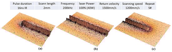 The return speed of the laser beam (from right to left) was set at 1500 [mm/s] with the laser turned off. The number of successive scanning paths ranged from 1 to 6. The quality and feasibility of the process were assessed based on the ablation depth and the formation of pile-ups. To precisely measure the ablation depth and the pile-up after each scanning pass, the surface required the minimum surface roughness; therefore, the test surface was polished to obtain a surface roughness of Ra < 50 [nm]. To achieve this surface quality, the procedure summarized in Table 2 was followed. A confocal microscope (NanoFocus) was used to measure the ablation depths. Each experiment was conducted three times, with measurements taken in three different positions: (1) left, (2) middle, and (3) right of the laser path, as illustrated in Figure 1b. The average value for each area was recorded and is reported and discussed. In general, all the measurements showed a significantly low deviation, and, thus, the process can be considered highly repeatable.