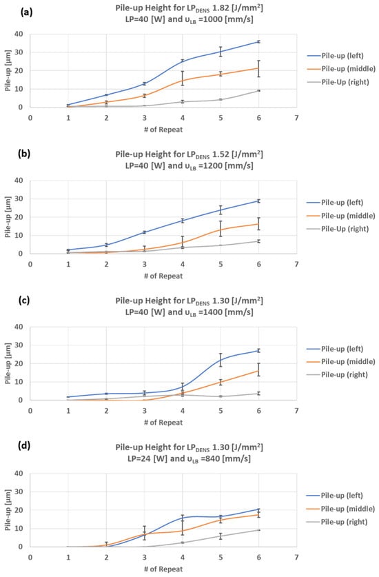 Pile-up heights for (a) 1.82 [J/mm2], (b) 1.52 [J/mm2], (c) 1.30 [J/mm2], and (d) 1.82 [J/mm2] with 24 [W] LP.