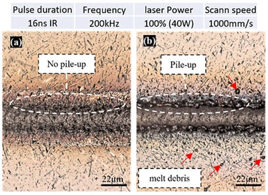 When matter is irradiated by a high-intensity laser, some surface degradation occurs []. There are three main mechanisms that lead to optical surface damage. Firstly, the metal fragments created during ablation explode on the metal surface, resulting in morphological changes []. Secondly, laser-induced periodic surface structures (LIPSSs), which are surface features that are created after laser irradiation, also lead to morphological changes []. Thirdly, the excited atoms and ions, due to laser irradiation, interact with air molecules in the environment, forming metal oxides, nitrides, etc., leading to chemical modifications. These chemical modifications are also responsible for optical surface damage []. All these three factors are responsible for surface alterations. Specifically, morphological changes lead to surface pattern wavelengths that are much shorter than the wavelength of the illuminating light. This pattern traps more photons, leading to surface darkening. Moreover, the existence of oxides on the surface also results in compounds with a black or dark color. These dark colors increase the absorptivity of the metal []. Furthermore, during the interaction of the laser with the material due to explosive melt ejection, nano- and micro-cavities are generated []. The formation of these cavities on the irradiated surface might result in uneven laser absorption as the surface is irradiated in successive passes. The non-uniformity in energy absorption caused by these cavities also results in a uniform temperature distribution, which forces the molten material to be expelled around the boundary of the ablation region []. Therefore, the material after abruption from the melt pool freezes on the upper surface of the workpiece near the boundaries of the ablation zone, which consequently leads to pile-up formation on the upper surface of the workpiece []. The above brief review of the laser–matter interaction and melt behavior supports the necessity of extensive research regarding the laser machining of different materials and alloys.