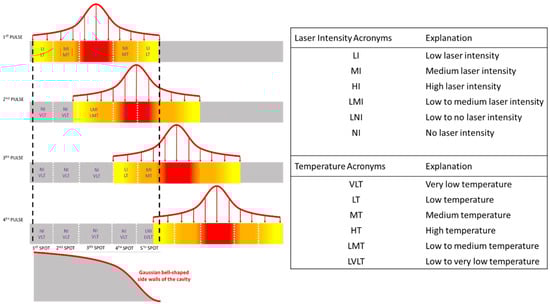 The cavity shape is highly dependent on the shape of the laser beam, as schematically shown in Figure 9. It is assumed that the first laser pulse irradiates the region between the two black-dashed lines, which is the region of the wall analyzed in this study. To explain this mechanism graphically, this region is divided into five sub-regions, which are called “spots” in this paper. Each spot is irradiated with different intensities, so each develops different temperatures, which leads to different ablations.