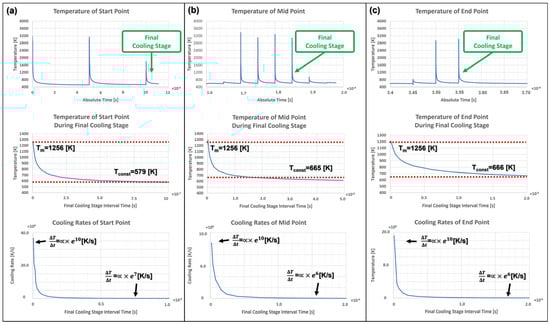 Temperature evolution and cooling rate for the 3rd pattern repeat of (a) the start-point, (b) mid-point, and (c) end-point.