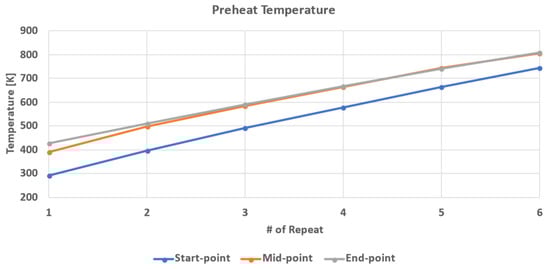 As observed in the results of the simulations, the time between two consecutive irradiations of the same point of the control volume is not enough to allow its complete cooling down. This means that each pattern repeat begins from a higher temperature. Thus, an increasing preheat temperature is observed in all the pattern repeats, except for the start-point of the first pattern repeat (see Figure 10). Moreover, as observed in Figure 11, the mid- and end-points of the first pattern repeat are also preheated. This phenomenon does not happen due to the prior irradiation of these points from the laser but rather due to the heat that is transferred to these points via conduction from the rest of the material that has already been irradiated by the laser. Heat accumulation during the process can be utilized to enhance the overall efficiency of the process. However, it is equally important to consider it during process planning to select the optimal machining conditions. The temperature increase may necessitate a re-evaluation of the machining parameters as the initial conditions dynamically change.