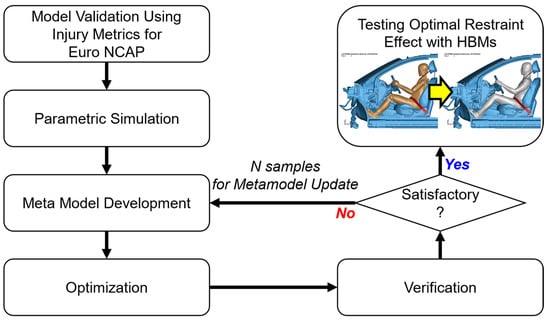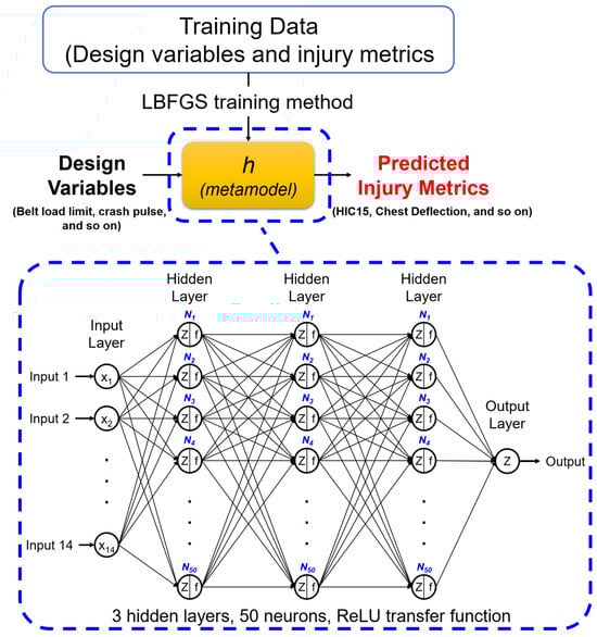 This section describes the process of optimizing occupant restraint systems for the Euro NCAP MPDB offset frontal crash test condition using a neural network (Figure 1). First, a mid-sized sedan sled model with the THOR dummy was developed and validated with Euro NCAP MPDB frontal sled test results. Second, 500 parametric simulations were performed, randomly varying fourteen design variables of occupant restraint systems. Parametric crash simulations were performed using design variable combinations generated using the Latin hypercube sampling (LHS) method, a widely used random sampling technique []. Crash simulation results were used to develop a metamodel that could explain relationships between design variables of restraint systems and dummy injury values. Subsequently, a genetic algorithm was used to find the optimal restraint design setting, which could maximize the Euro NCAP score, using the metamodel. The optimal design identified by the optimization was verified via crash simulation. If there was a large discrepancy between predicted and actual Euro NCAP scores, the process of optimization was repeated by updating the metamodel with additional crash simulation results using newly generated design variables. This process was repeated until the optimal design from the metamodel was verified by crash simulation results. Lastly, the optimally derived THOR dummy restraint configuration was applied to a mid-size human body model to test the protective effect of the restraint system on the human occupant.