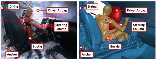 The difficulty of developing an occupant restraint system is increasing due to enhanced safety regulations and consumer rating testing protocols []. The reinforcement of safety requirements involves stringent thresholds for injury criteria, increased crash severity during testing, and the introduction of new anthropometric devices. The European new car assessment programme (Euro NCAP) introduced the THOR 50M (Test Device for Human Occupant Restraint 50th percentile male) dummy in the 2020 new frontal impact test with a mobile progressive deformable barrier (MPDB), as opposed to the previously used Hybrid III 50th percentile male dummy (H-III 50M) []. The THOR dummy is known to be more biofidelic than the H-III dummy during frontal crash conditions, holding promise for facilitating advancements in occupant restraint devices [,]. The thoracic region of the vehicle occupant is one of the most frequently injured body regions during frontal crashes []. While the H-III dummy measures chest deflection at one location, the THOR dummy measures chest deflection at four points, employing IR-TRACC (Infra-Red Telescoping Rod for the Assessment of Chest Compression) sensors. The THOR dummy has demonstrated higher sensitivity to changes in the restraint system design than the Hybrid III dummy, potentially due to its ability to capture the local deformation of the thoracic region of the dummy []. Therefore, it is necessary to investigate the influence of the restraint design system on occupant protection for the newly introduced THOR dummy.