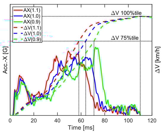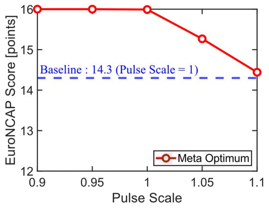 Figure 17 shows the verification simulation results of the meta optimum design, constraining the pulse scale to 0.9, 0.95, 1.0, 1.05, and 1.1. Please note that the result for the pulse scale, 1.0, was the same as the meta optimum results shown in Table 6. It was found that the softer the pulse, the higher the Euro NCAP score for the considered vehicle crash pulse in the current study. It was also evident that the three injury criteria, for which the baseline design did not reach the lower-bound threshold, decreased as the vehicle crash pulse became softer (Figure 13, Figure 14 and Figure 15).