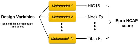 Overview of calculation of the cost function value. Eleven metamodels were utilized in the optimization to predict the Euro NCAP score.