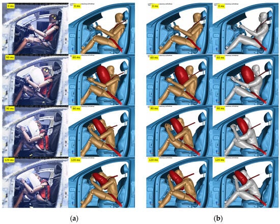 Test and simulation: (a) baseline; (b) meta optimum. (a) shows the test (left) and simulation (right) of the THOR dummy with baseline restraint systems. (b) shows the simulation of the THOR dummy (left) and GHBM-O model (right) with the optimized restraint systems.