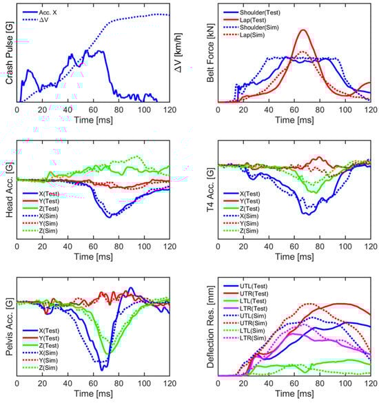 The crash simulation model demonstrated similar responses to the test results in terms of dummy responses and injury criteria values (Figure 7 and Figure 8). The simulation model demonstrated a 4% higher Euro NCAP score than that of the test result (Table 4). The maximum resultant chest deflection (Rmax) from the simulation was almost identical to the test data. The crucial injury parameter with the most pronounced impact in parametric simulation results, the maximum chest deflection, exhibited a remarkable accuracy, with an error rate of only 0.14%, showing a test result of 43.90 mm and an analytical result of 43.84 mm. The largest discrepancy between the model and test data was observed in the leg region. The model predicted a 17% higher lower leg score than that of test data. Based on these results, it could be concluded that the simulation model closely aligned with the test results.
