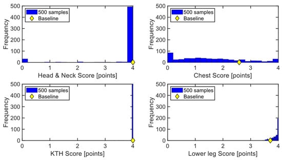 Figure 9 summarizes the distribution of calculated scores of four regions of the body obtained from a total of 500 crash simulation results. Overall, the risk was highest in the chest and abdomen area, followed by the lower leg area and the head and neck area. The KTH area had an average score of 3.99 points out of 4 points, indicating that this region would have little issue within the design domain. The best Euro NCAP score obtained among the 500 simulations was 15.6 points, which was 1.3 points higher than that of the baseline condition. Still, the full score of 16 points was not achieved due to the chest and abdomen region.