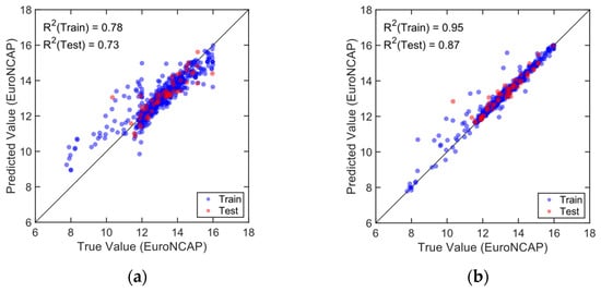 Euro NCAP score predicted results: (a) direct prediction of Euro NCAP score; (b) Euro NCAP score using individually predicted injury criterion values.