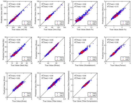 Utilizing the results from a total of 557 parametric crash simulation results, including the initial 500 designs and additional 57 designs, the final version of the metamodel was developed (see Table S1). Figure 10 displays the results of predicting Euro NCAP scores using two methods: one that predicts Euro NCAP scores directly and another that predicts the Euro NCAP scores based on the individually predicted injury criteria values. The X-axis represents Euro NCAP scores obtained from crash simulations (true value), while the Y-axis represents Euro NCAP scores predicted by the metamodel (predicted value). Points closer to the diagonal line, where y equals x, indicate more accurate predictions. When the Euro NCAP score was predicted using a single metamodel, the coefficient of determination for the test data set was 0.73. In contrast, when the Euro NCAP score was predicted using metamodels that could predict each injury metric value, the coefficient of determination for the test data set was 0.87. Figure 11 and Figure 12 display the accuracy of the metamodels in predicting individual injury metrics and present selected learning curves for these metamodels, respectively. This result implies that predicting individual injury metric values is more effective for forecasting the Euro NCAP score than directly predicting it.