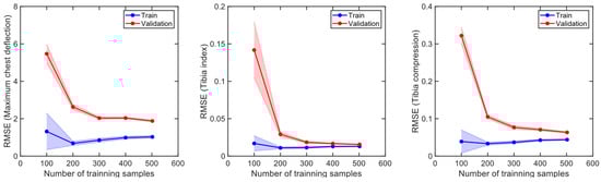 For the crash simulation, for which sophisticated models require substantial computation time, learning curve analysis was performed. The learning curve analysis from the current study indicated that around 300 frontal crash simulations were required to train a metamodel for predicting the injury criteria (Figure 12). Interestingly, Horii (2021) also demonstrated that the prediction accuracy of a response surface model for predicting HIC value starts to converge after the training sample size for simulations reaches 300 []. The author used multibody occupant and vehicle models, which were much simpler than the occupant and vehicle models used in the current study. Therefore, the 300-person sample size in a metamodel for predicting occupant behavior during a belted frontal crash condition might be applied to other frontal crash simulation models with various complexities. After the first round of the optimization trial, it is possible that the verification simulation of a meta optimum condition does not result in the predicted performance. A space-filling procedure is then required, which means that more training data can be generated by executing additional parametric crash simulations. Schneider et al. (2022) utilized the MaxPro method to maximize the contribution of each additional training sample to improve the prediction performance of metamodels [,].