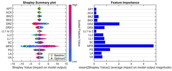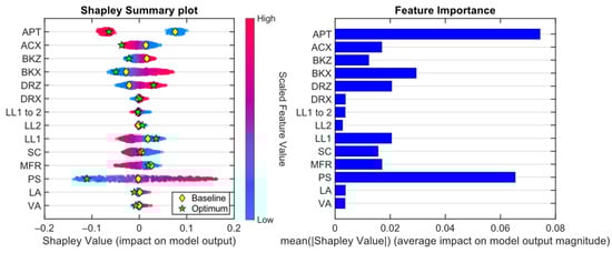 Even if a restraint device design for optimal solutions demonstrates an improvement in the extent of occupant injuries, it is still meaningful to understand factors driving such enhancements. Thus, trained metamodels were used not only for optimization but also for understanding effects of design variables on injury criteria of the THOR dummy in a frontal crash condition (Table 1). The Shapley additive explanation (SHAP) method [] was used for this purpose. The SHAP analysis was conducted based on a metamodel predicting injury criterion values for each specific area used in Euro NCAP score prediction for a given set of design variables (Table 2). The Shapley value represents the effect of each feature, which was the restraint system design variable, on predicted output, which was the injury criteria values. The range of change in each feature was normalized to be between 0 and 1, which meant minimum and maximum values, respectively. A positive Shapley value for a given set of feature values implied an increase in the output value, and vice versa. One of the major advantages of the SHAP method is its ability to not only reveal effect of each feature on the output values but also indicate the direction of change of the output value due to the feature value. The feature importance value, which is the average absolute value of Shapley values of considered ranges of feature values, indicates the magnitude of the effect of a feature on the output. It allows for comprehension of overall effects, enabling numerical ranking of significant variables. Identified important variables can then serve as key tuning factors during the development of countermeasures.