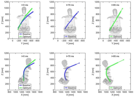 Comparison of belt routes and dummy kinematics of baseline and meta optimum designs.