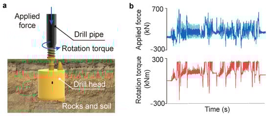 Schematic diagram of load on drill pipe. (a) Rotation torque and applied force acting on the drill pipe. (b) Time history of rotation torque and applied force.