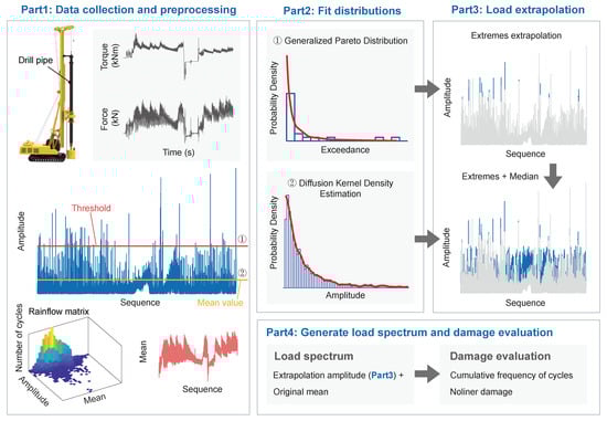 We propose a novel load extrapolation framework to effectively address the scenario of multiple non-stationary loads acting simultaneously. The torque and force loads are first processed using rainflow counting to obtain a sequence of amplitude and mean values. These values are then arranged in the order of their occurrence. To capture extreme amplitudes, the POT method is utilized in the proposed framework. By fitting the extreme loads using a Generalized Pareto Distribution (GPD), the extrapolation of extreme loads can be performed effectively. The median amplitudes are fitted using a Diffusion Kernel Density Estimation (DKDE) [,] method. This allows for an accurate estimation of the underlying probability density function, which is then used to extrapolate the median amplitudes accordingly. The final load spectrum is obtained by combining the mean sequence and the extrapolated amplitude sequence. The main contributions of the proposed load spectrum extrapolation framework are as follows: