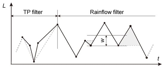 Before obtaining the mean and amplitude of the rainflow count for torque and force, the loads undergo a filtering process that consists of two steps: a turning point filter and a hysteresis filter based on the rainflow counts, as shown in Figure 3 [].
