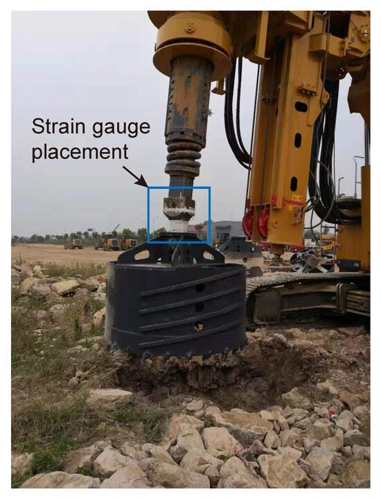 In this case, the load of the drill pipe was tested and a load spectrum was compiled using the drilling soil condition of a rotary drilling rig. Figure 4 illustrates the placement of the strain gauge on the drill pipe of the XR360E rotary drilling rig. The frequency of the signal acquisition was 50 Hz.