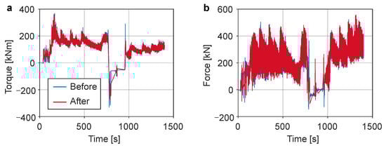 Torque (a) and force (b) of drill pipe before (blue) and after (red) data preprocessing.