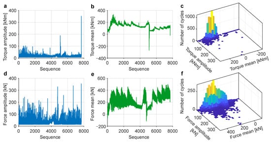 Simultaneous rainflow count results. (a) Torque amplitude and sequence, (b) torque mean and sequence, (c) torque rainflow matrix, (d) force amplitude and sequence, (e) force mean and sequence, and (f) force rainflow matrix.