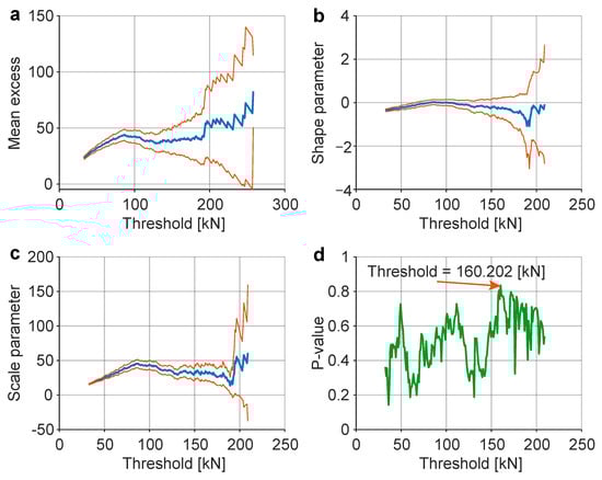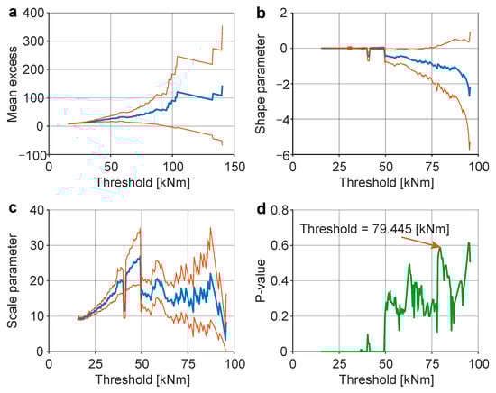 The GPD distribution was utilized to fit the extremes, while the selection of the threshold involved a combination of a mean excess plot and goodness-of-fit (p-value) analysis performed under various threshold-parameter scenarios. The threshold selection for torque and force amplitude is shown in Figure 7 and Figure 8.